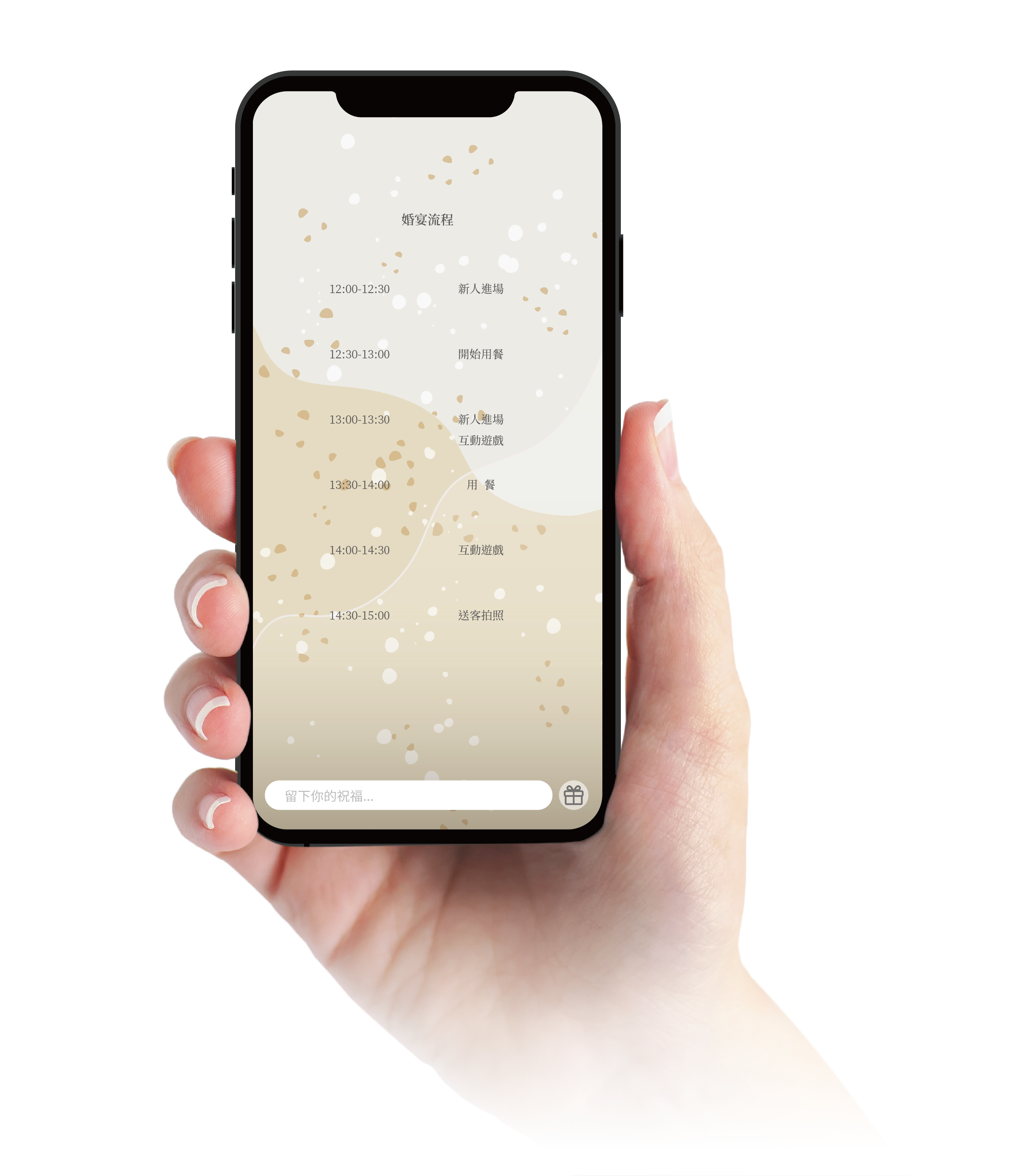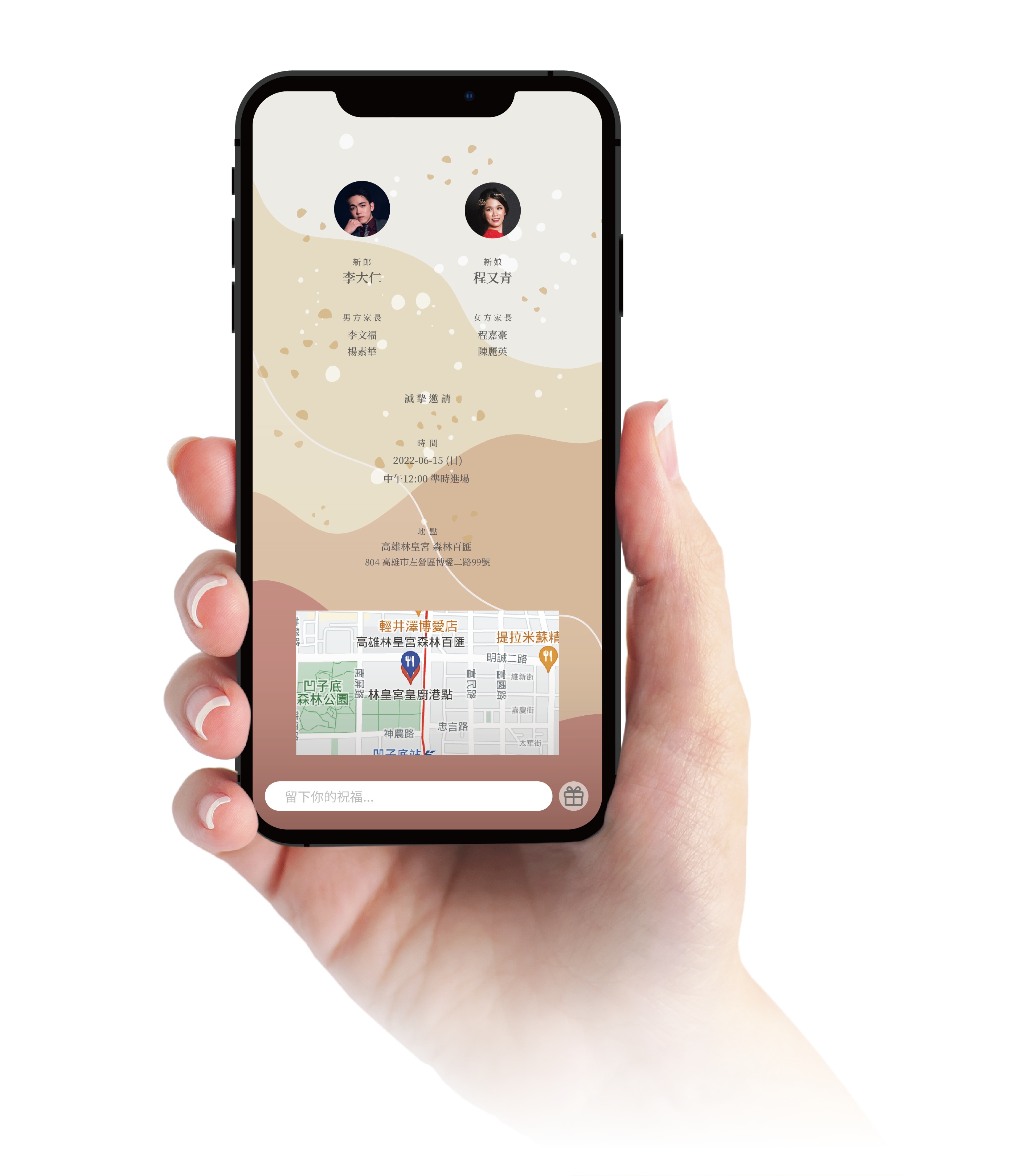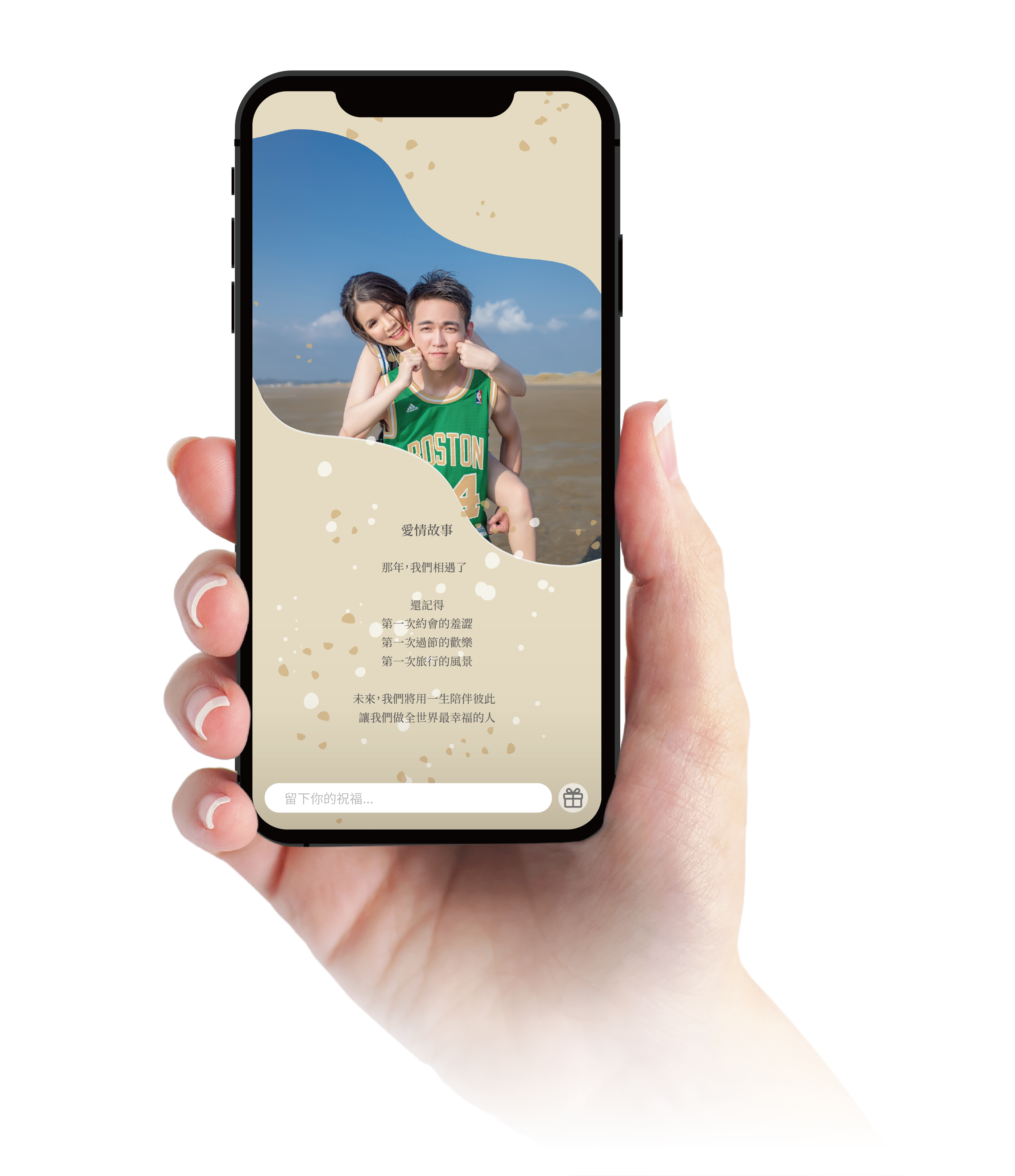 互動式電子喜帖,讓喜帖不再只是一張傳遞喜訊的卡片,而是可以雙向互動的婚禮社群!親友將在喜帖上留言、送禮,給予新人溫暖且即時的祝福喲!