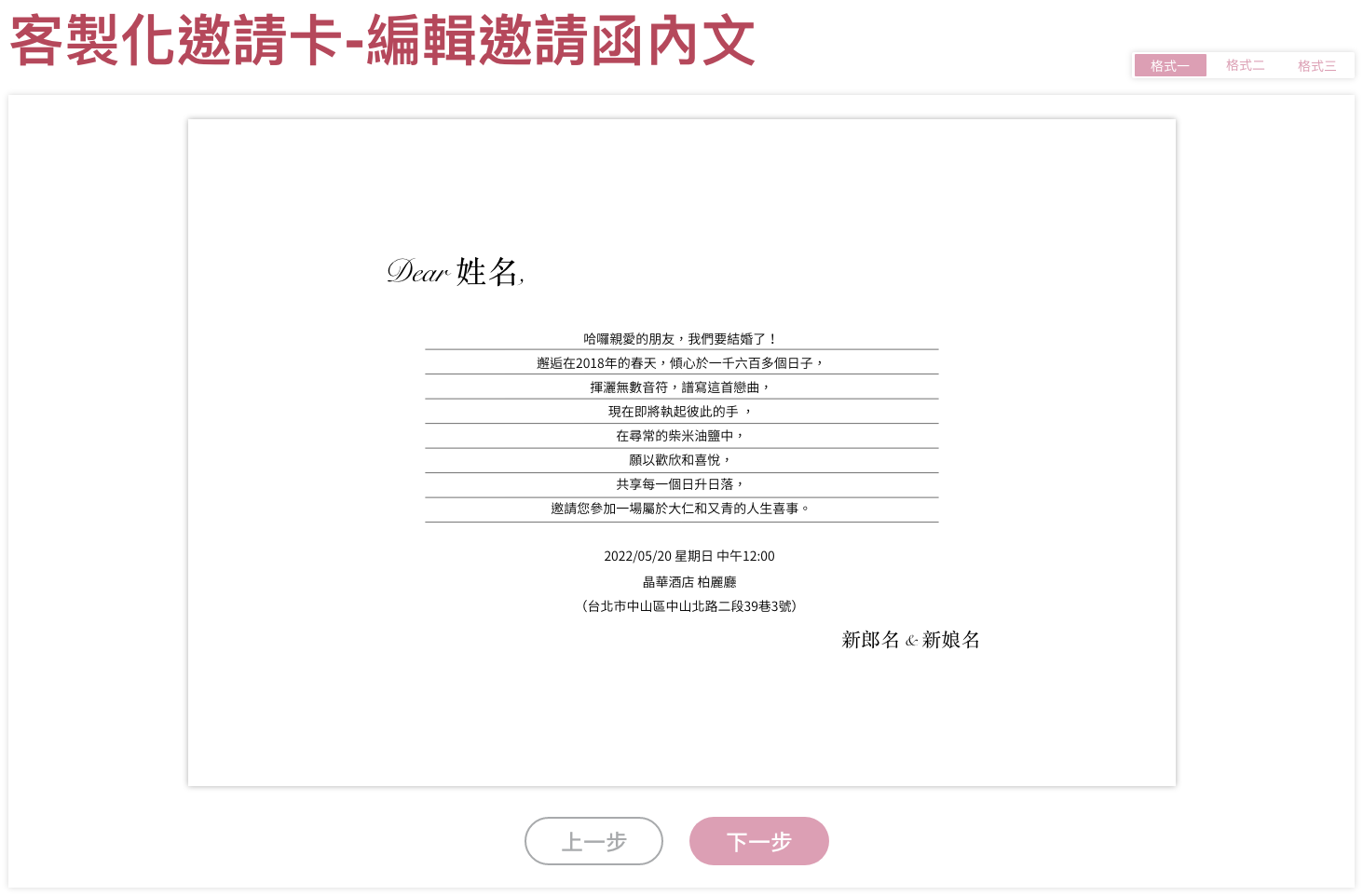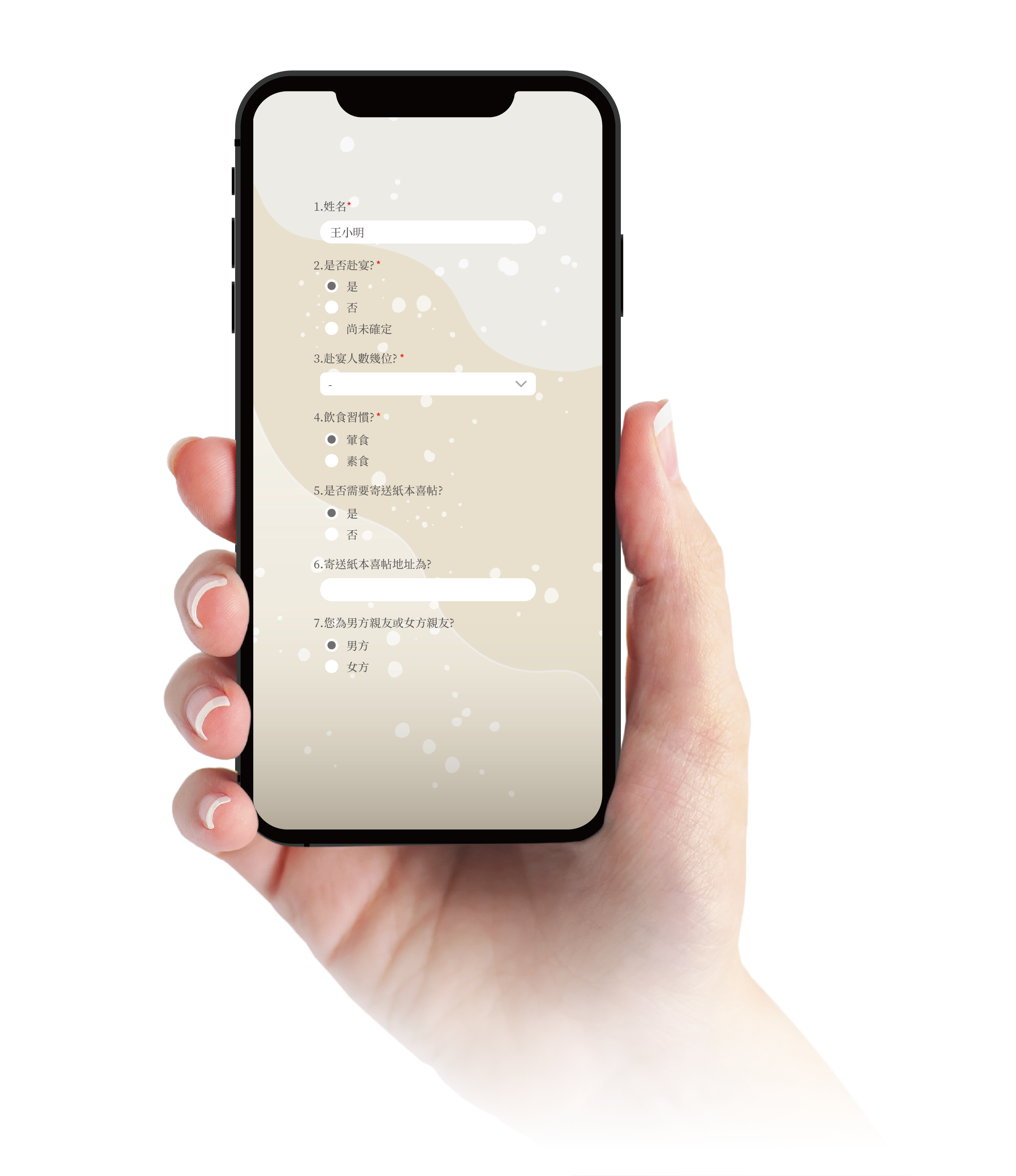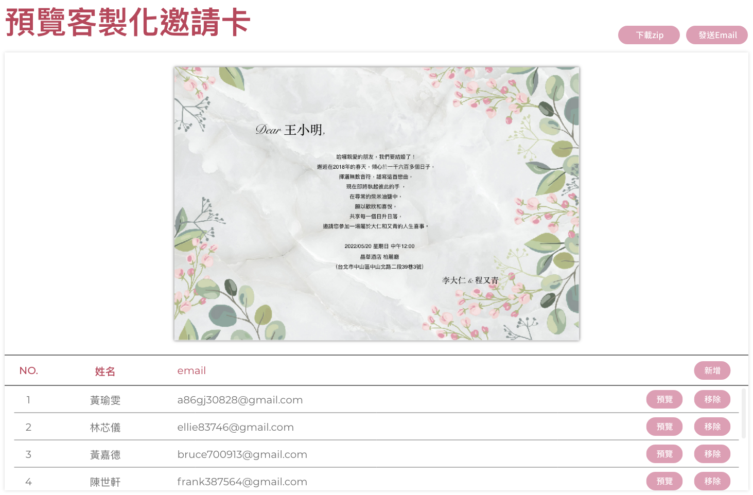 收到署名的邀請卡,總給人一種被重視的感覺。現在新人可以透過婚宴管理後台,一鍵製作每一位與會者的專屬邀請卡!
