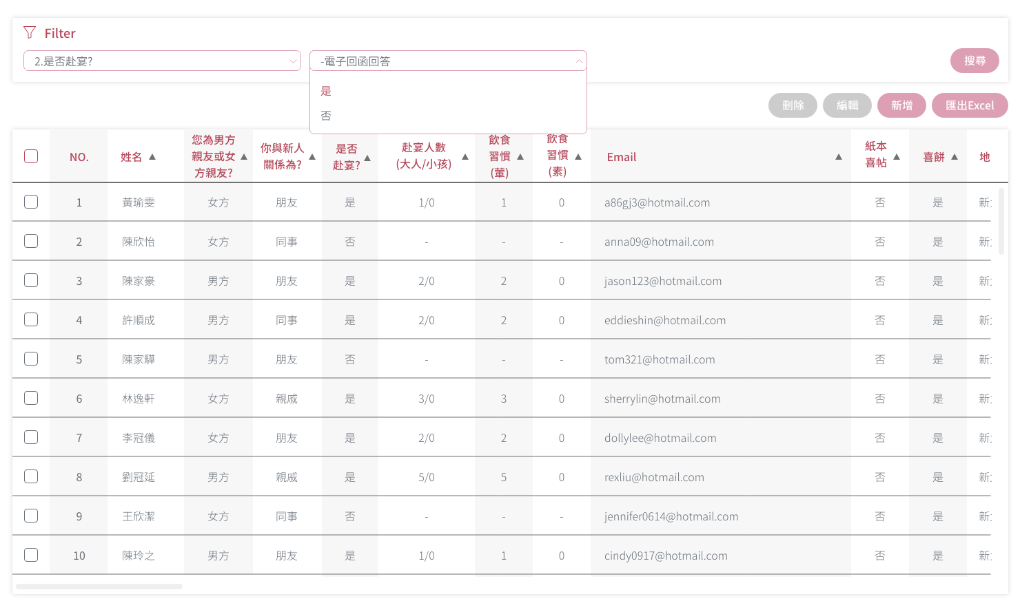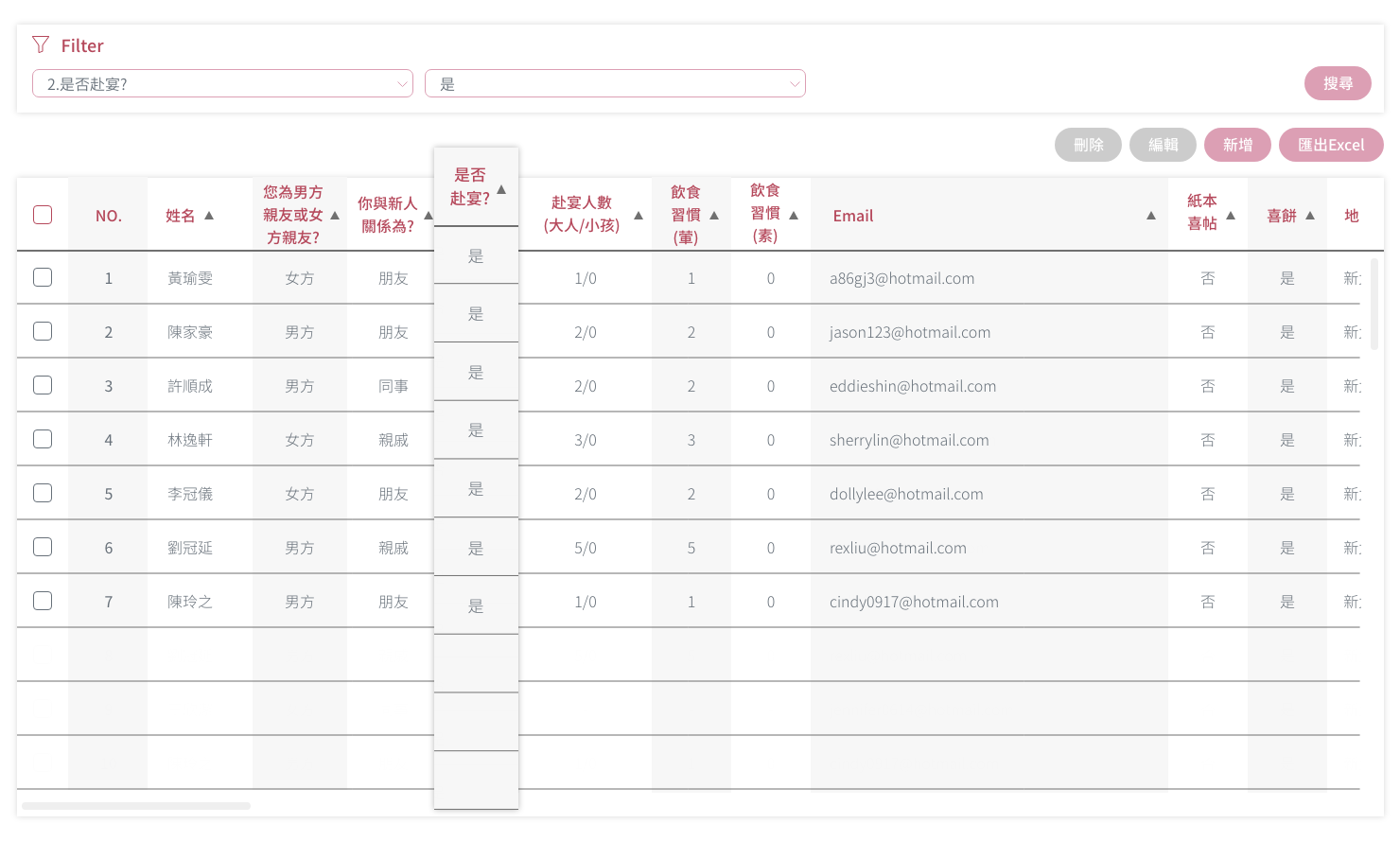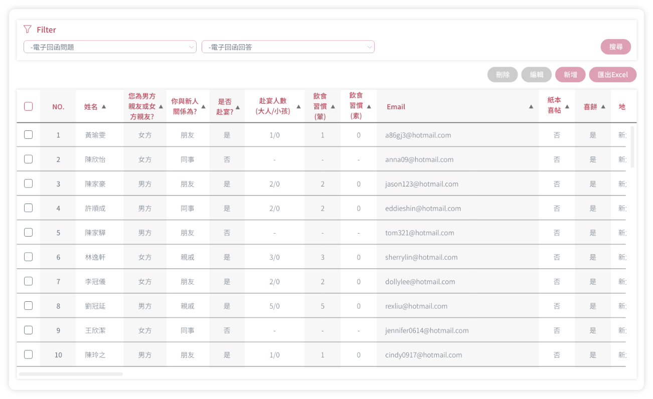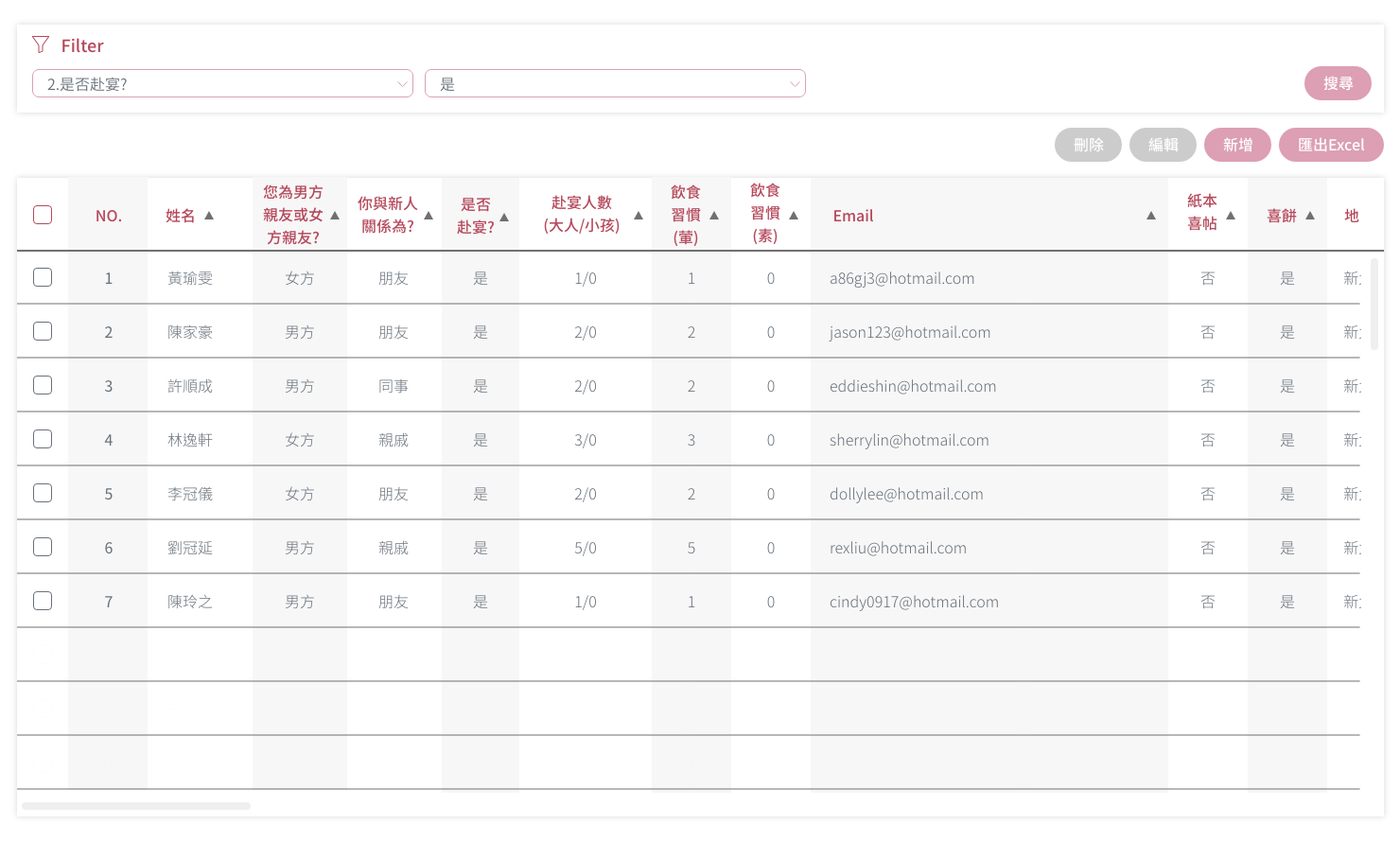 當賓客填寫完表單,資料會立即傳送到新人端,新人可以彈性地透過新增、修改、匯出資料等功能,輕鬆地掌握赴宴名單!