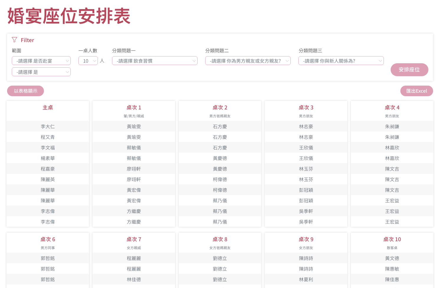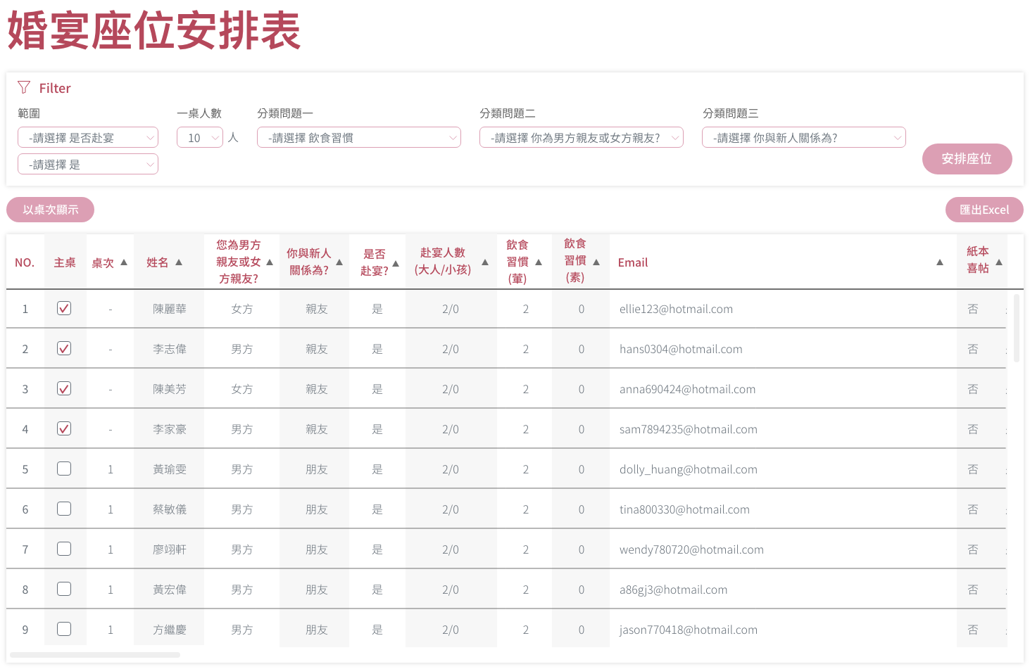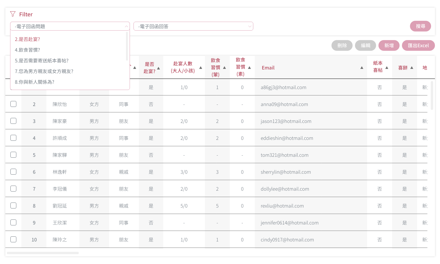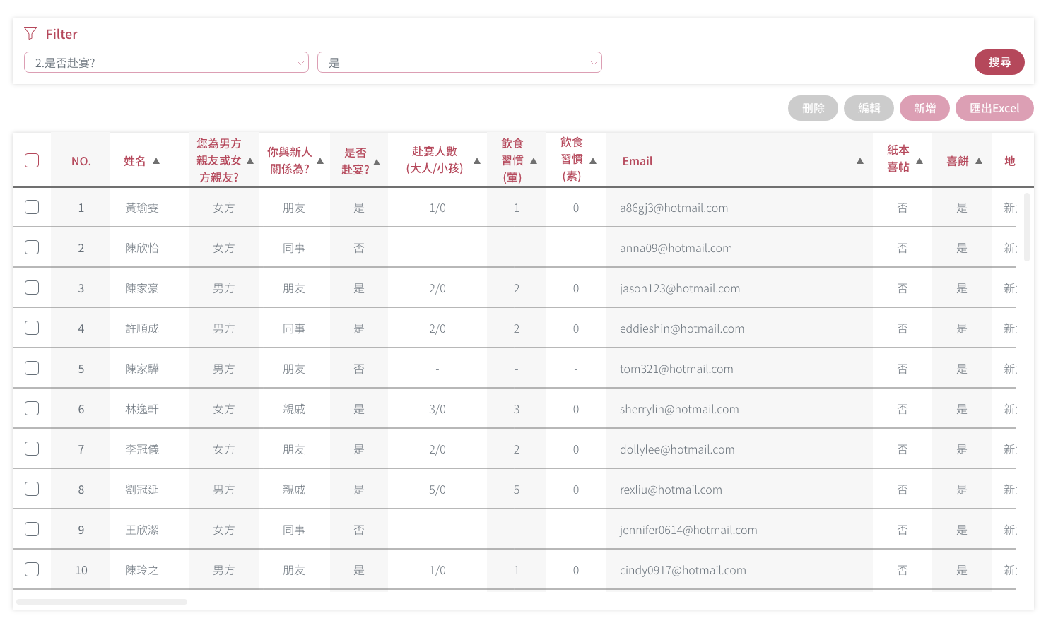 當賓客填寫完表單,資料會立即傳送到新人端,新人可以彈性地透過新增、修改、匯出資料等功能,輕鬆地掌握赴宴名單!