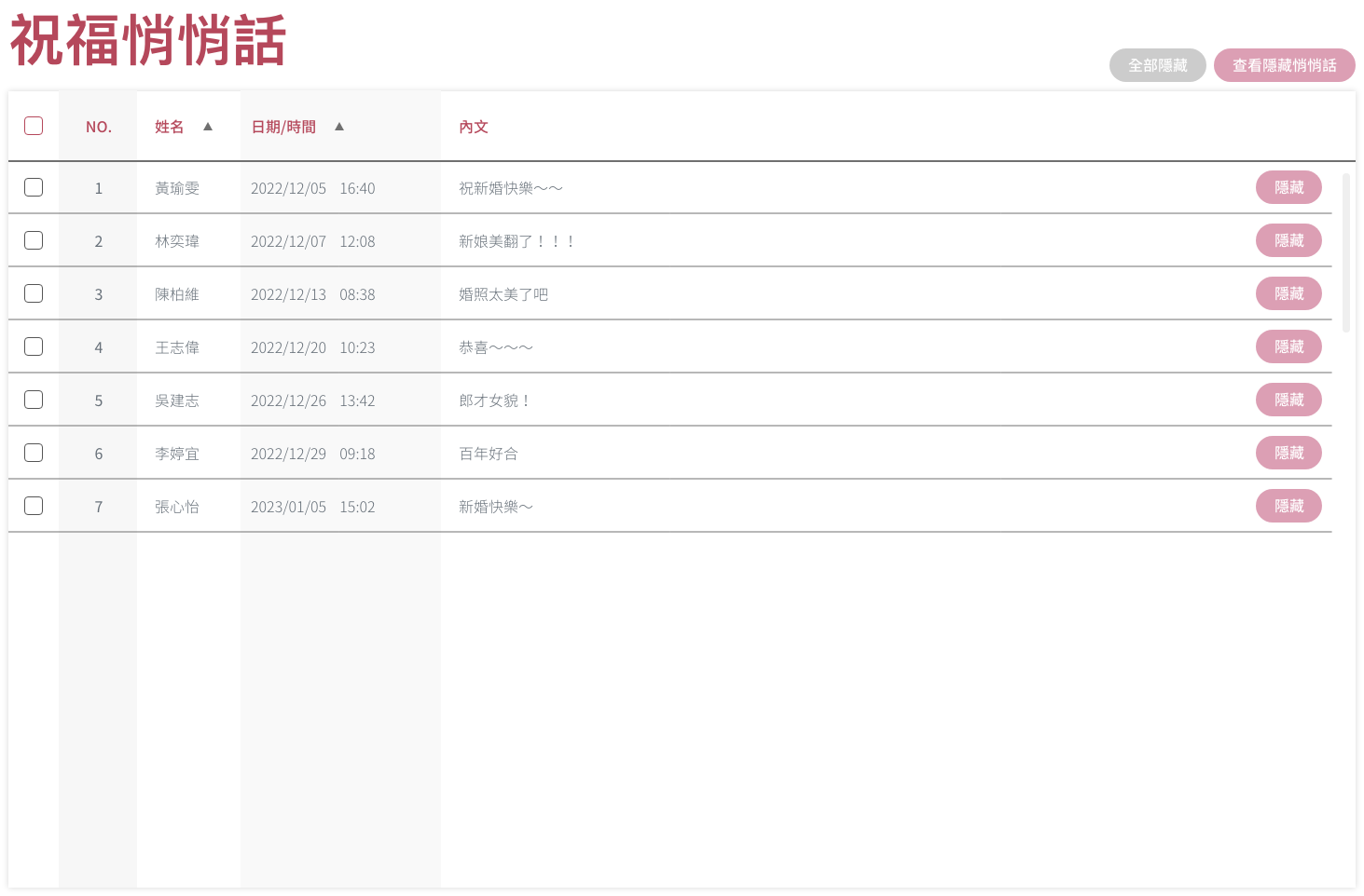 親友們在喜帖上留下的每一則祝福,都會即時的傳遞到新人手中,新人可以自行決定是否要將祝福設定為私下珍藏。