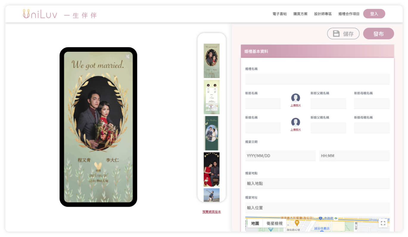 新人可以透過即時預覽,隨時地,在製作地過程中確認成品(手機版喜帖、電腦版婚禮網站)的樣貌。