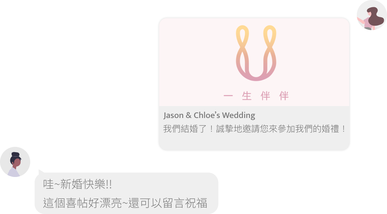 透過 Line, Facebook, IG 等社群媒體,輕鬆地將喜訊傳遞出去,親友們將透過喜帖齊聚,還能留言互動給予祝福。